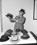 A. A. Lund, president of the Fort Worth, Texas, Chamber of Commerce, shown looking at felt hats. He is wearing a double-breasted suit and a felt hat. He is holding a hat and there are nine more of various shapes and styles on a table in front of him.