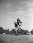 Ed Wright is one of the top players on the Paschal High School football team. The Panther back is shown practicing cradling the football and busting through the middle. The 212-pound star is one of the leading contestant for all-district honors. He is practicing on the football field dressed in his uniform and a helmet. The young man is wearing a leather helmet, and his uniform includes light socks and dark laceup boots. A goal post is in the background and other players are in the distance. "ANOTHER PLAYER apt to contest Masonic Home's versatile Gordy Brown for all-district honors is ED WRIGHT, powerful 212-pound Paschal star. He scored once in the Panthers' opener (Star-Telegram photos by Tom Dillard.) "Star-Telegram Morn. Sep 23, 1941"