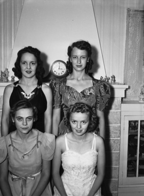 Some of the new officers of the Polytechnic Rainbow Assembly Number 85, who were installed at the Polytechnic Masonic Hall. Top, standing, are Alice Marshall, Worthy Associate Advisor; and Jerry Beckelman, Sister of Hope. Bottom, kneeling, are Miss Floyce Bailey, Worthy Advisor; and Faustina Howard, Sister of Faith. They are wearing semi-formal dresses. Behind them is a mantel on which there are several figurines and a clock. Published in the Fort Worth Star-Telegram morning edition, September 22, 1940.