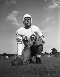 J. C. Pool is a veteran on the Amon Carter Riverside High School football team. He is an outstanding player on both sides of the ball - offense and defense. Pool is the starting center. He has earned high praise from his coaches in the first two games. Pool is shown kneeling on the field, dressed in a number 46 football uniform and a leather helmet. The young man is on a practice field with cyclone fence around the edge. "(Star-Telegram Photo.)" Published Star-Telegram Eve. Oct. 2, 1941.