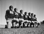 The Texas Christian University football team has made several changes to the line this off season. After numerous promotions and demotions, these seven boys will open the season as the starting line against Tulsa on Saturday. The are left to right Phil Roach (80), Woodrow Adams (70), Leonard Pugh (60), Billy Blackstone (50), Captain Bill Crawford (61), Darrell Palmer (71), and Bruce Alford (83). The Frogs are adopting a new numbering system this season with ends wearing 80's, tackles 70's, guards 60's, and centers 50's. The letterman line is kneeling on the football field, dressed in their uniforms. Published in the Fort Worth Star-Telegram evening edition, September 23, 1941.