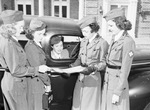 Red Cross Motor Corporation. Officers. Left to right, Mrs. W. H. Slay Junior, Miss Sue Harding, Mrs. W. C. Stripling Junior, Mrs. Roger Owings and Miss Jean McLean. Four of the five officers are standing beside a car while Mrs. Stripling Junior is inside the car looking out the window. All five women are looking down at a map that Mrs. Owings is holding. They are all dressed in Red Cross uniform and hats.