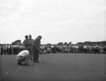 Here's Clinton Russell, blind golfer from Duluth, Minnesota, attempting a nine-foot putt for a bogey-four on the eighth hole of his match with Marvin Shannon of Fort Worth for the Blind Golfer's title at Rockwood Park Golf Course, Sunday. Jimmy Koehler (crouching), Russell's adviser from Duluth, has just sighted the putt. Russell missed the putt by inches and Shannon won with a four to go five up. In the back is Shannon, second from the right, talking to instructor Skeet Fincher. There is a crowd watching in the background held off the green by a rope fence. Published in the Fort Worth Star-Telegram morning edition, October 27, 1941.