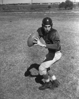 Texas Wesleyan College's (T. W. C.) football opponents are going to see a lot of the young man pictured here getting ready to fire a pass. He's Ruel Hoffman, Texas Wesleyan's tailback from Paschal High. Hoffman weighs 156 pounds and also punts. Hoffman is wearing his uniform with a jersey with the number 26 on it over his shoulder pads, padded pants, cleats, and a helmet. He is standing in a field holding the football in both hands, prepared to pass. Star-Telegram Evening, October 8 1940.