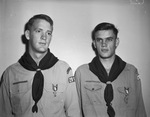 Two of the youths who were awarded Eagle Scout badges at a court of honor were, left to right, Bob and Bill Fannin, of Explorer Troop No. 2012. They are the twin sons of Mr. and Mrs. Oliver W. Fannin. They are standing against a blank wall, wearing their scout uniforms.