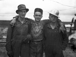 One of the busiest and biggest oil areas in the Permian Basin is slaughter Pool of Southwestern Hockley, Southwestern Cochran and Northwestern Terry Counties. W. Tillery, left, pipe racker; G. A. Hataway, backup man, W. J. Morris, fireman. They are standing next to each other and posing for a picture. Published in Fort Worth Star-Telegram, morning edition, October 26, 1941.