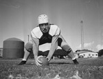 Walter "Sleepy" Finnegan is one of the stars on a talented Masonic Home High School football team. Finnegan clocks in at 160-pounds. He starts at center on offense and shifts to end on defense. The pivot man is shown practicing pitching the ball. He is dressed in a number 21 football uniform and a helmet. There is a smokestack and a building in the background. There is also a water tank or cistern on the left behind him, and other individuals in the background.