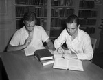 John Blanton, left, and Wilford Revercomb are football players at Arlington Heights High School. The gridiron stars are sitting at an oak table in the library, up to their ears in books. They prepare for an upcoming test. Mr. Blanton is dressed in a short-sleeve woven-pattern light button-up shirt with one breast pocket. Mr. Revercomb is wearing a long-sleeve collared shirt with two breast pockets. Each is holding a pencil. Rows of books are running along the shelves in the background. (Star-Telegram Photos by Tom Dillard) Published Star-Telegram Morn. Oct 23, 1941.