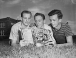 Players on the Diamond Hill High School football team are engaging in a different kind of studying. Reading up on football, left to right, are Maurice Watts, Floyd Daniels and Fred Daniels. They are shown laying in the grass, reading through a 1941 Football Pictorial Yearbook. Maurice is wearing a short-sleeve collared shirt. Floyd is dressed in a pinstripe shirt. Fred is wearing a t-shirt with horizontal stripe and has a signet ring, possibly his class ring. The high school is in the background. (Star-Telegram Photos by Tom Dillard) Published Star-Telegram Morn. Oct 23, 1941.