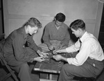 Football players at Handley High School are playing a game of dominoes before practice. Sitting around a table on one wood and one metal folding chair, left to right, are Bob Craig, Harold Moore, and Vernon Purselly. Craig is wearing a dress shirt with a yoke and tailored trousers. Moors is dressed in a button-up shirt and khaki-looking trousers. Purselly is wearing a striped dress shirt with a woven pattern, a yoke, has on suspenders, and herringbone trousers. (Star-Telegram Photos by Tom Dillard) Published Star-Telegram Morn. Oct 23, 1941.