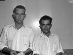 Marion Miley, a nationally known golf star, and her mother Mrs. Fred Miley were killed on September 28, 1941. They were staying at the Lexington Country Club in Lexington, Kentucky when the robbery-homicide occurred. Two Fort Worth Police detectives were following a lead on another case when they saw a two-toned Buick with Kentucky plates parked outside a beer tavern. On a hunch, the detectives brought the driver and passenger in for questioning. The suspects, left to right, are Tom Penney and Leo H. Gaddis. The Fort Worth detectives will question the suspects fully before turning them over to Lexington, Kentucky, police. Mr. Penney is an ex-convict from Fort Worth, Texas, and suspected gunman in the Miley murder. He is dressed in a polka-dot shirt. Mr. Gaddis is a friend of Penney. He is wearing a pinstripe button-up shirt with cuffed sleeves.