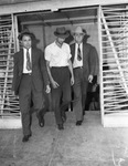 Marion Miley, a nationally known golf star, and her mother Mrs. Fred Miley were killed on September 28, 1941. They were staying at the Lexington Country Club in Lexington, Kentucky, when the robbery-homicide occurred. Two Fort Worth Police detectives were following a lead on another case when they saw a two-toned Buick with Kentucky plates parked outside a beer tavern. On a hunch, the detectives brought the suspect in for questioning. Pictured left to right, are Detective Theron Brooks, Tom Penney, and Detective Ed Smith. The detectives questioned Penney and he confessed to being the gunman in the Miley shooting. The detectives are transferring the prisoner to the Hotel Texas for a shave, bath, and a change of clothes. Penney is handcuffed to Detective Brooks. Every precaution is being taken to prevent a possible escape attempt. The detectives are dressed in hats and suits. Mr. Penney is wearing a hat, dress shirt with cuffed sleeves and trousers.