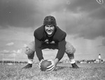 Emmett Sherrod is a freshman on the Texas Christian University football team. The sturdy young fellow has been named the starting center for when the Polliwog squad takes on the Baylor Cubs. Sherrod is a member of the famous North Side Football Family. He is shown crouching over the football and practicing the snap. He is dressed in a number 44 football uniform. Published in the Fort Worth Star-Telegram morning edition, October 27 1941.