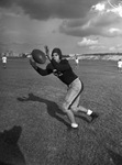 Billy Hearne is a freshman on the Texas Christian University Wogs football team. He was a standout tackle on the 1940 Arlington Heights High School team, but is transitioning well into his new position. The tall, rangy 190-pounder is a great pass receiver. He is expected to be a favorite target on the field Tuesday night against the Baylor Cubs. Hearne is pictured catching passes in practice. He is dressed in a number 53 football uniform. Published in Fort Worth Star-Telegram, evening edition, October 27, 1941