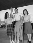 Kyle Gillespie, halfback on the Texas Christian University football team, is waving goodbye to his teammates, as they leave for New York to take on the Fordham Rams. Consoling him in his misery are Lois Meador, left, and Julia Mayo. Gillespie suffered an ankle fracture and will miss some time while the injury heals. He is dressed in a button-up shirt and trousers, and is walking with crutches. Miss Meador is wearing a collared blouse, sweater, and a plaid skirt. Miss Mayo is dressed in a knit sweater, pearl necklace and a skirt. Published in The Fort Worth Star-Telegram morning edition, October 23, 1941