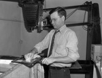 M. O. McPhail is a staffer at the Fort Worth Star-Telegram. He works as a laboratory employee. Mr. McPhail is shown wiping down a metal sheet. He is wearing a button-up shirt with cuffed sleeves, a necktie, and trousers.