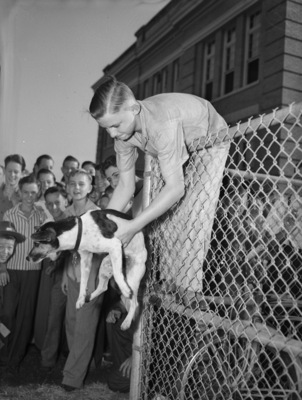 Youths from all over Fort Worth, Texas are starting back to school on the warm September morning. Wooten Brown, a student at E. M. Daggett Junior High School, is leaning over a chain-link fence with his fox terrier. The pup, "Pepper," followed Wooten to school, who is shooing him home. A group of children are standing in the background, watching the exchange.