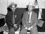 Two of four persons who are always interested in livestock and, when seen by the Chuck Wagon Gossiper at the Texas State Fair, were talking over plans for two approaching Hereford auctions as well as renewing friendship are pictured here. They are Roy Largent of the firm of Largent & Steevens, Merkel, Texas, (left), John Yantis of Brownwood, Texas. Both Mr. Largent and Mr. Yantis are shown seated, wearing suits, ties and hats and smiling for the camera. They are planning for their upcoming Hereford auctions. Published in the Fort Worth Star-Telegram morning edition, October 16, 1941.