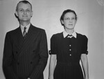 Shaw employees, J. R. Russell and Bessie Kraus. Man dressed in a double-breasted striped suit with a tie and woman with glasses in a dark dress with white collar and Scottish Terrier brooch.