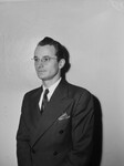 Shaw employees, John Peadon. Man in double-breasted suit with patterned tie and a pocket square and glasses.