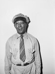 Shaw's employees, porter. Man wearing a uniform with a striped tie, belt, and cap with a black bill.