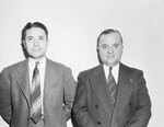 Shaw employees, H. C. Hastings, right. The man on the right is wearing a suit, light colored shirt and striped tie. Man on left is wearing a double-breast suit jacket with a round pin on the right lapel, a light colored shirt, and striped tie.