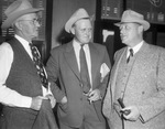 Cattle Director's Meeting at Eagle Pass, Texas was attended by, left to right, Joe B. Matthews of Albany, Jim Weymouth, and C. E. Weymouth, both of Amarillo, Texas. The men are standing next to each other and engaged in a conversation. They are wearing suits and hats. Jim Weymouth has a cigarette in his hand and a newspaper tucked under his arm, while C. E. Weymouth has a pipe in his hand. Published in the Fort Worth Star-Telegram morning edition, November 19, 1941.