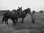Farm hand Herman Pope is shown at the halter of two mares, working the Jinkins Hereford Ranch. The ranch is located near Normangee, Texas and specializes in raising Herefords. They expect to sell forty head at auction. In addition to cattle, the ranch also plants crops and raises colts. Mr. Pope is dressed in a hat, collared shirt, overalls, and a coat.