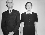 Shaw employees, J. R. Russell and Bessie Kraus. Man dressed in a double-breasted striped suit with a tie and woman with glasses in a dark dress with white collar and Scottish Terrier brooch.