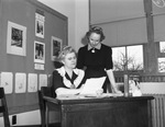 Miss Flossie Kysar (left) and Miss Mary Ferguson at a Junior League art education program. Miss Kysar is shown seated at a desk while Miss Ferguson stands next to her. They are both looking at a paper that Miss Kysar is holding up. Both women are wearing dark dresses, however Miss Kysars's dress has a large lace collar around it. On one corner of the desk, a book with the title "Let's Learn to Spell". Behind the duo is a bulletin board. Published in The Fort Worth Star-Telegram Sunday Edition March 8, 1942.