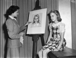 Artist Emily Guthrie Smith is shown drawing a likeness of student Doris Sheppard at a Junior League art education program. Doris is shown sitting on a wooden bench across from Miss Smith as she draws her. Doris is wearing a gingham-printed dress with some lace detailing on her collar, while Miss Smith wears a jacket and skirt ensemble. As she works, Miss Smith holds a rag and a pastel crayon in her right hand while she uses another pastel to complete Doris's portrait. Miss Smith is a child portrait painter. Behind the two is a curtain. Published in The Fort Worth Star-Telegram Sunday Edition March 8, 1942.
