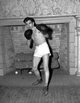 Amateur boxers from all around the area are preparing for the 1942 Golden Gloves District Tournament in Fort Worth, Texas. Kenneth Bellmard is a 16-year old entrant in the bantamweight, Class A division for inexperienced fighters. Kenneth recently moved to Fort Worth, Texas, from Oklahoma. He is shown practicing his fighting stance in front of a fireplace at the Medical Arts building.