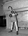 Amateur boxers from all around the area are preparing for the 1942 Golden Gloves District Tournament in Fort Worth, Texas. Coleman Hutchins is new to the Golden Gloves, but hardly a beginner at boxing. Weighing in at 110 pounds, Hutchins will compete with the flyweights. He has a record of 25 victories in 26 amateur bouts. He is shown training in front of a fireplace at the Medical Arts building.