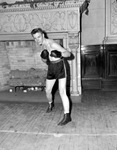 Amateur boxers from all around the area are preparing for the 1942 Golden Gloves District Tournament in Fort Worth, Texas. One of the challengers for the bantamweight class is Tittle Mitchell. He is shown standing in front of a fireplace at the Medical Art Building. Mitchell is practicing his fighting pose, in preparation for the tournament. He is wearing boxing gloves and shorts.