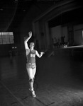 The Texas Wesleyan College (T. W. C.) basketball team is looking to repeat the strong 1940 season. Their success hinges on the play of several new starters. One of the young Rams is Adrian McFathers. He is shown posing in an action shot, as he works out in the gymnasium. He is dressed in a number 99 basketball uniform. There is a stage in the background of the Recreation Building.