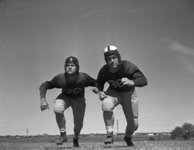 Texas Wesleyan College football players (left to right) Buford McCauley, sophomore from Lipan, Texas, and Co-Captain Homer Craig, senior from Fort Worth, Texas will be the starting guards. McCauley weighs 190 and has one letter to his credit. Craig, a mighty 220-pounder, has won three letters at Texas Wesleyan College (T. W. C.). Both men are wearing uniforms with jerseys over their shoulder pads, Mr. McCauley's has the number "30" on his while Mr. Craig has either the number "36" or "38" on his, pants, cleats, and helmets. The men are standing beside each other in a field and running forward towards the camera. Star-Telegram Evening, September 12 1940.
