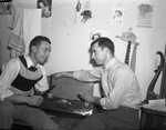 Two starters on the Texas Wesleyan College (T. W. C.) basketball team are leaving school to join the military. Packing their bags, left to right, are roommates Bryan Truitt and team captain Clifton McNeely. Both men are products of Greenwood, Texas, and are planning to join the Air Corps or another branch of the armed forces. Truitt is dressed in a collared shirt, striped sweater vest, and trousers. McNeeley has been the Rams' top scored with 50 points in the last three games. He is wearing a striped dress shirt and trousers.