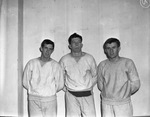 The Texas Christian University (T. C. U.) basketball team is practicing for an upcoming game. The Frogs, left to right, are Buddy Barron, Floppy Blackmon, and Al Wagler. They are standing against a wall, dressed in sweatshirts and sweatpants.