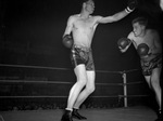 The 1942 Golden Gloves State Tournament is being held at Will Rogers Memorial Coliseum in Fort Worth, Texas. Competing for the heavyweight title are Gilbert Stromquist and Corporal J. Olcott Phillips. Stromquist stands six-feet-eight-inches tall. He is shown swinging his left glove. Phillips is ducking below the blow and adding a two-fisted attack. Phillips went on to win the match and the state title.