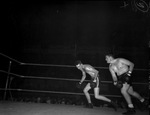 The 1942 Golden Gloves District Tournament is being held at Will Rogers Memorial Coliseum in Fort Worth, Texas. Squaring off in a battle for the heavyweight finals, left to right, are Pee Wee Holton and J. B. "Punkin" Smith. Holton weighs in at 178 pounds. He is shown scrambling to the other side of the ring. Smith is a 225-pound freshman at Texas Christian University. Holton went on to win the decision.
