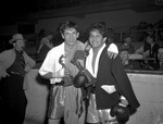 The 1942 Golden Gloves District Tournament is being held at Will Rogers Memorial Coliseum in Fort Worth, Texas. Receiving their trophies, left to right, are Leonard Zunigo and Jose Andreas. Andreas is the Flyweight champion of the Fort Worth, Texas, district. He is wearing boxing gloves, trunks, and a jacket over his shoulders. Zunigo has a towel around his shoulder and tape on his hands. A crowd of people are watching in the background.