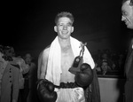 The 1942 Golden Gloves District Tournament is being held at Will Rogers Memorial Coliseum in Fort Worth, Texas. Hubert Gray is holding a trophy, following his winning match. Gray, of Wichita Falls, Texas, is the champion of the bantamweight division. He is still wearing his boxing gloves and has a towel over his shoulders. Bandages are covering cuts above both eyebrows.