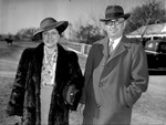 Mr. and Mrs. Chester Hyde, of Crowley, Louisiana. The couple is standing next to each other with smiles on their faces. Mrs. Hyde is wearing a fur coat with a patterned blouse and skirt underneath, while her husband wears a buttoned up coat with a pair of eyeglasses. Both are also wearing brimmed hats, however Mrs. Hyde's is set askew on her head. Behind them is a fenced off house and a truck parked near the fence, at right. The duo traveled around West Texas inspecting registered Polled Hereford cattle. Mr. Hyde is a Polled Hereford breeder and is Southern director of the American Polled Hereford Association.