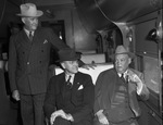 Texas Southwestern Cattle Raisers Association convention attendees (left to right) John C. Burns, W. L. Pier and Fort Worth Mayor I. N. McGray, are all on a train. Burns is standing up as Pier and McGray sit next to each other. McGray is holding a cigarette in his left hand.