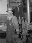 One of the most closely watched deep wildcats in North Texas is the Sinclair Prairie Oil Company No. 1 Jones, Singletary survey, one mile east of Forrestburg in Southeastern Montague County. Shown here is D. A. Perry, motorman. Mr. Perry is wearing work clothes and hard hat and leaning against a large piece of machinery. Published in the Fort Worth Star-Telegram, April 5, 1942.