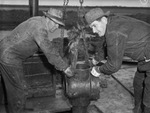 One of the most active areas in West Central Texas is the Wimberly pool of southern Jones County. Shown here are tool dresser C. J. Horne (left) and C. A. Lawrence, driller, on the Bailey Balkan No. 1 Bill Dunigan, another new producer. Mr. Horne and Mr. Lawrence are wearing work clothes and hats and holding a piece of machinery that is connected to a hook by a rope. Published in the Fort Worth Star-Telegram morning edition, March 8, 1942.