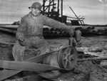 One of the most active areas in West Central Texas is the Wimberly pool of southern Jones County. Shown here is E. C. Irwin, crew member on the Butler & Horne No. 4-A Winberly. Mr. Irvin is wearing work clothes and hard hat and sitting behind a belt and pulley. Behind him, there is a large number of long pipes on the ground. Star-Telegram Morning, March 8 1942.