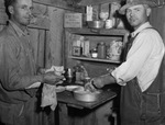 Some activities at the drilling site of Sinclair Prairie Oil Company No. 1 Henderson, W. E. Martin Survey Prospect in Southern Montague County, 1 1/2 miles east of Denver includes work and others. Washing dishes in a make-shift kitchen are, left to right, K. W. Posey and W. C. Starks. They are washing from a small container. There are various food supplies on the shelves. Published in the Fort Worth Star-Telegram morning edition, April 12, 1942.