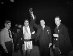 The 1942 Golden Gloves National Tournament is being held in Chicago, Illinois. Pictured left to right are Scotty McLaughlin, Tom Attra, a Chicago, Illinois, Amateur Athletic Union (AAU) official, and Dan Coates. Mr. McLaughlin, of Fort Worth, Texas, is a coach for the Texas Golden Gloves boxers. He is dressed in a striped button-up shirt, necktie, and trousers. Attra, of Austin, Texas, is the Texas Golden Gloves champion in the light-heavyweight division. He is being declared a winner by the Chicago, Illinois, official. Mr. Coates, of Fort Worth, Texas, is dressed in a collared shirt, coat, and trousers.