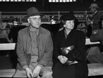 Among visitors to the Southwestern Exposition and Fat Stock Show were Mr. and Mrs. John R. Black, owners of a ranch near Granbury, Texas. The married couple is sitting on a bench and looking towards their lefts. Behind them are some cattle being guided by their owners around the venue. Mrs. Black is wearing a dark overcoat and a hat. She is holding a purse in her lap. Mr. Black is wearing a hat, eyeglasses, a collared shirt, coat and trousers.